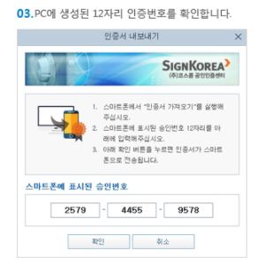 2.'스마트폰→ PC로 인증서 복사'를 누르면 자동으로 컴퓨터 화면에 생선된 12자리의 인증번호를 확인할 수 있습니다.